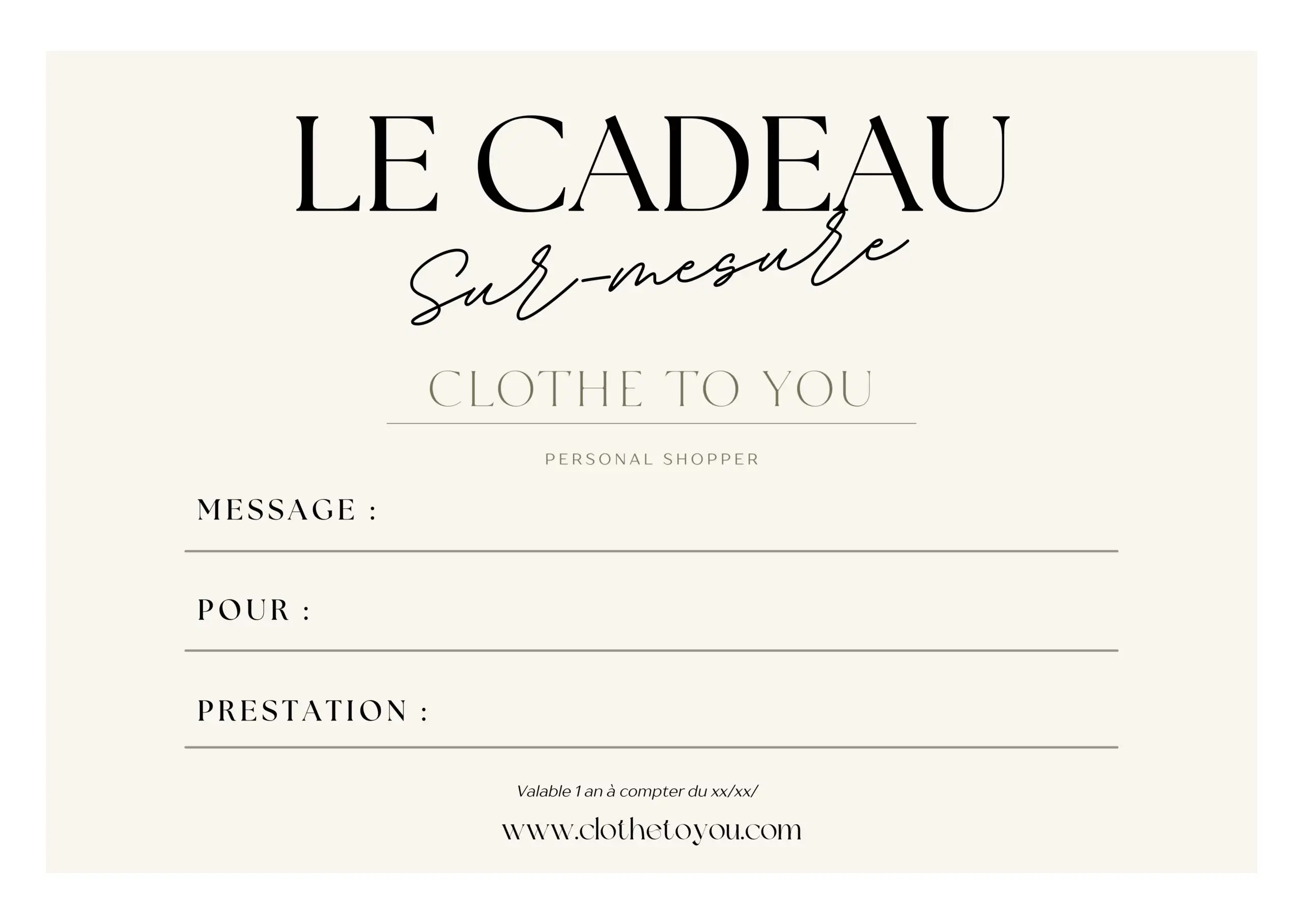 Faites plaisir avec style et bienveillance avec une carte cadeau personnalisée : une invitation à prendre soin de soi et à révéler son style ! Conseil en image, personal shopping, ou tri de dressing : chaque prestation est un moment précieux, pensé sur-mesure pour se reconnecter avec son image.